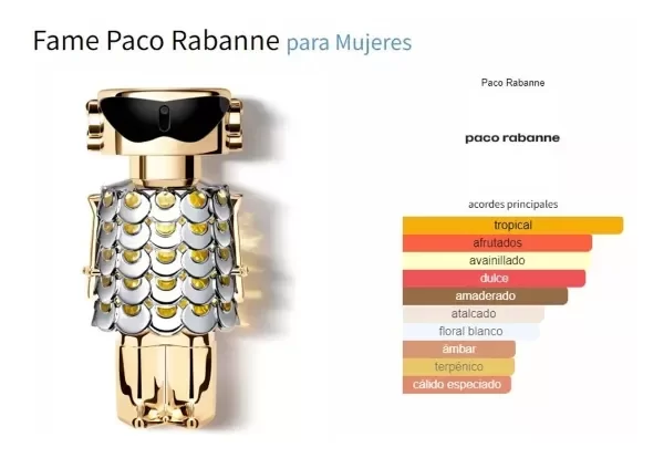 Fame de Paco Rabanne es una fragancia de la familia olfativa Almizcle Floral Amaderado para Mujeres. Esta fragancia es nueva. Fame se lanzó en 2022. Las Notas de Salida son mango y bergamota; las Notas de Corazón son jazmín y incienso de olíbano , las Notas de Fondo son vainilla y sándalo